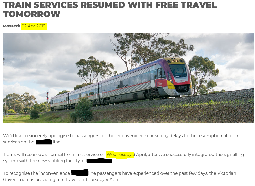 I have attempted to de-identify the line in this story because this is the line that I travel on most days. I very much appreciate that hard working people are transporting me safely to my destination every day. 100 per cent of the time I have arrived safe. They have also, according to the stats, being consistently reliable (90-95 per cent) and around 85 per cent punctual. By my standards they are doing a great job.